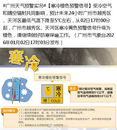 受冷空气和晴空辐射共同影响,预计未来24小时广州市越秀区、天河区最低气温下降至5℃左右,从02日17时00分起,广州市越秀区、天河区寒冷黄色预警信号升级为橙色。