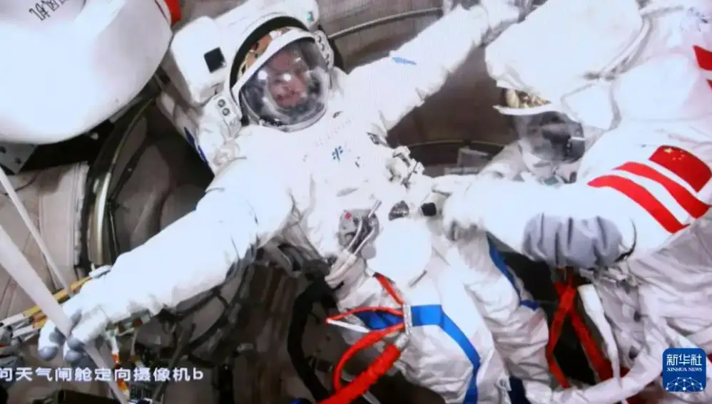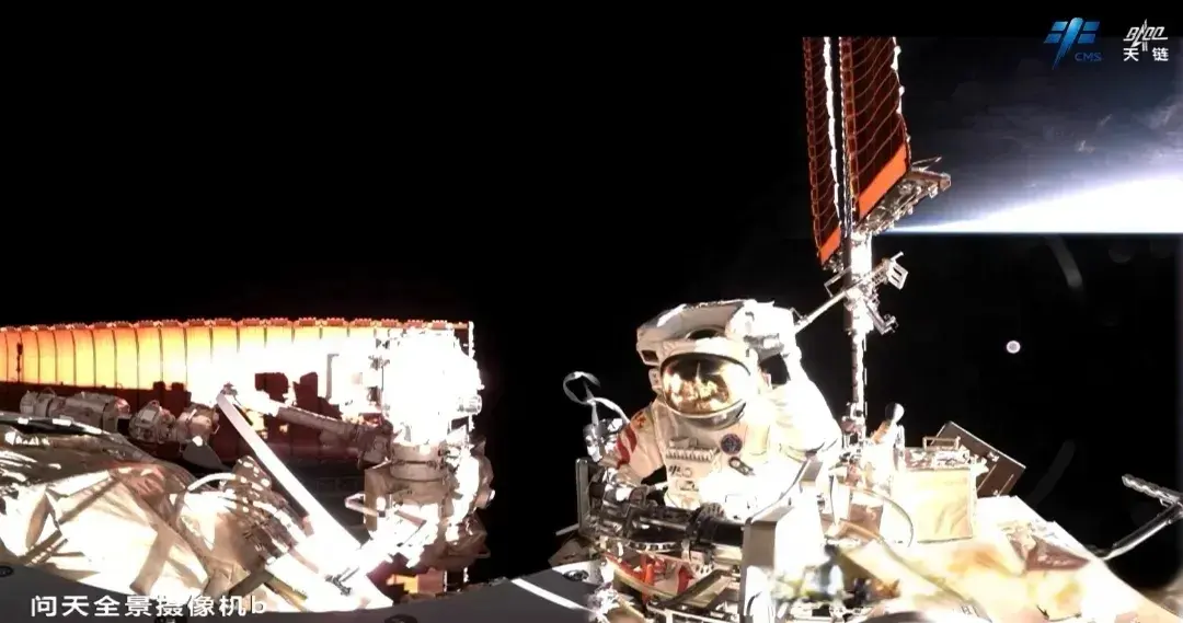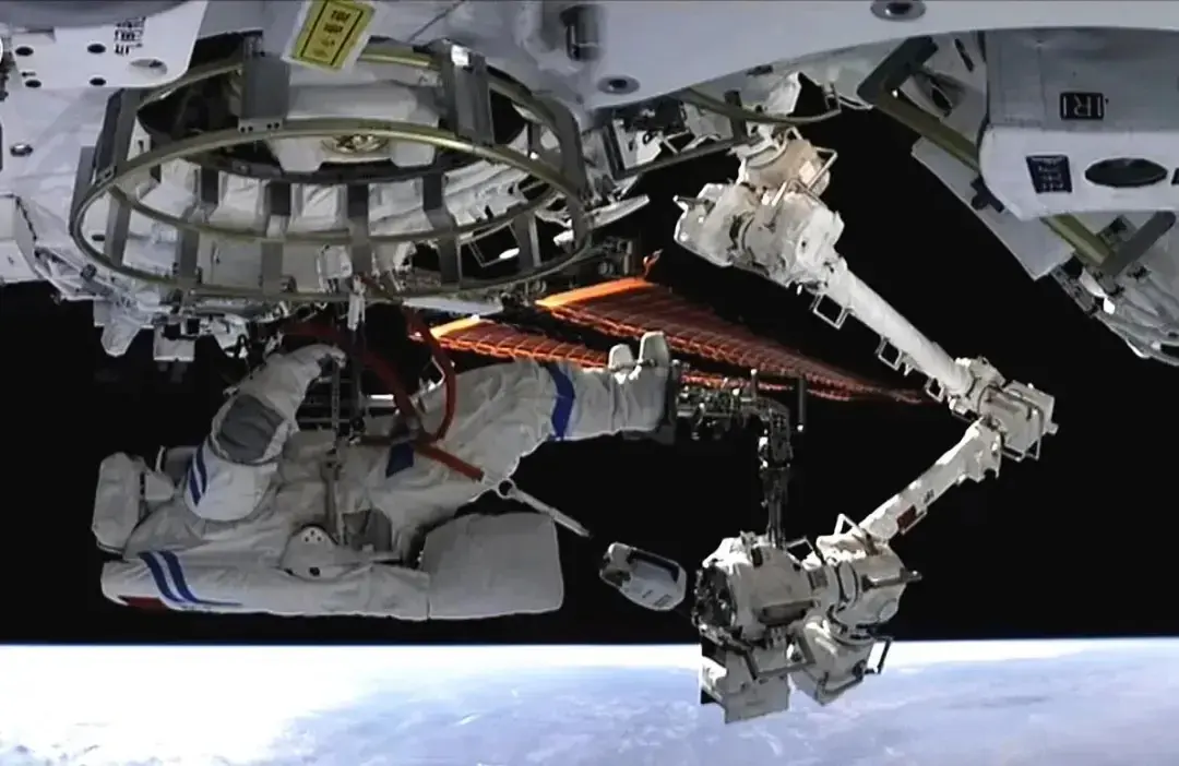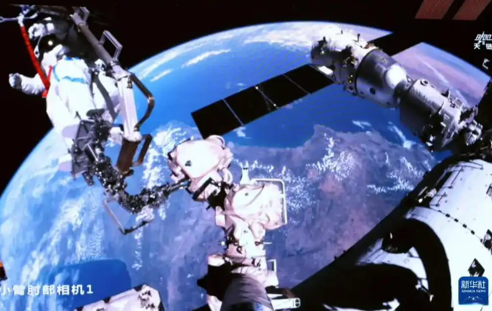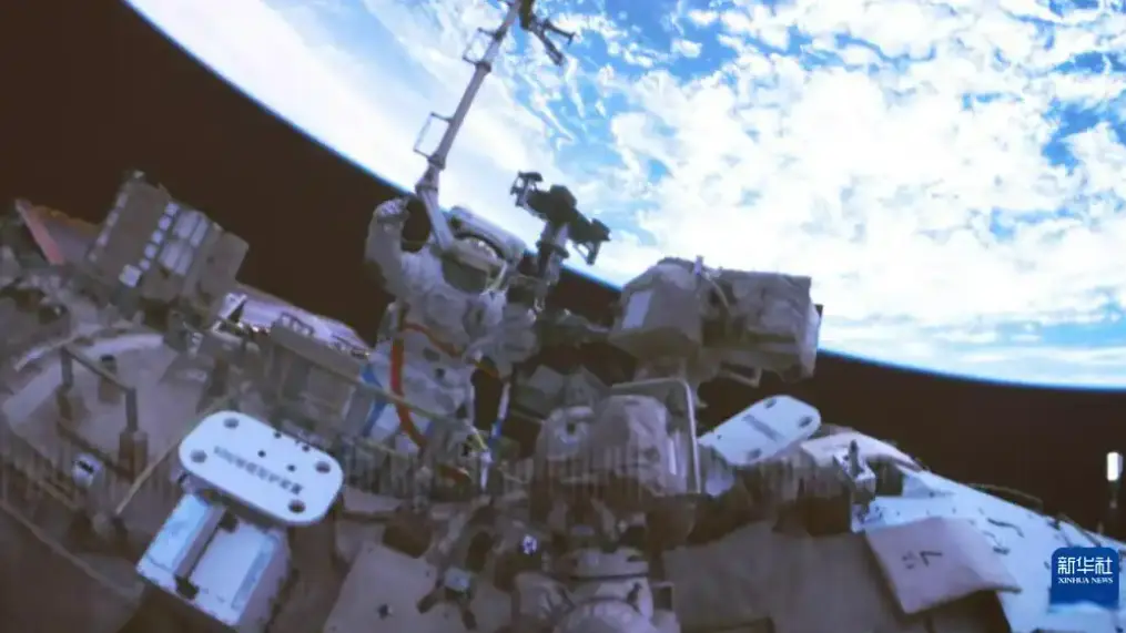 航天员张陆、武飞在空间站外进行了长达5.5小时的舱外作业,圆满完成空间碎片防护装置安装、舱外设备设施巡检等任务。