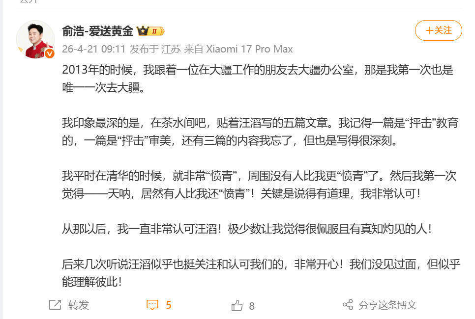 据俞浩回忆,其在造访大疆期间,对办公区张贴的五篇由汪滔撰写的文章印象深刻。这些文章重点涉及对教育与审美等领域的深刻批判。俞浩表示,自己早年在清华大学求学期间带有强烈的批判精神,而在阅读上述文章后,对汪滔的观点与底层逻辑表达了高度的认同。